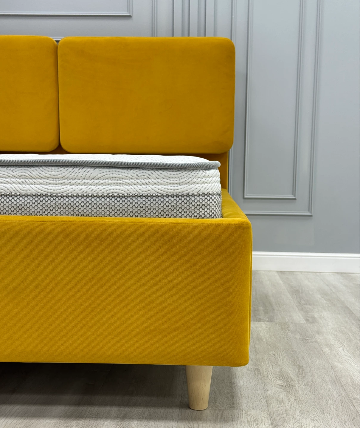 Интерьерная кровать «Selena» – эксклюзивная модель для фирменных салонов в трендовом минималистичном дизайне со съемными подушками и возможностью выбора высоты ножек.