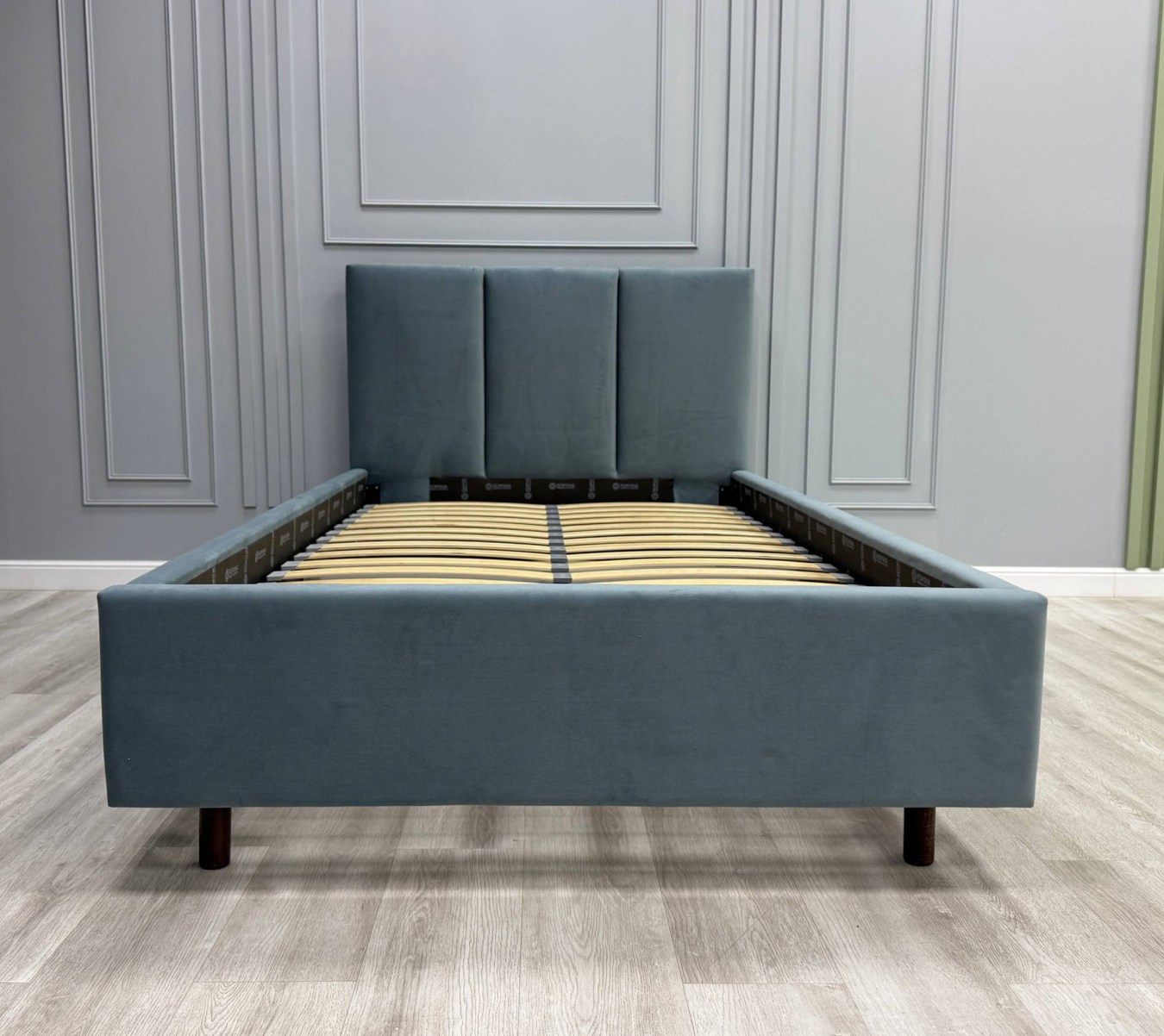 Односпальная кровать на высоких деревянных ножках в современном стиле выглядит гармонично и привлекательно. Благодаря компактным размерам она отлично подходит для комнаты подростка или молодежной спальни.