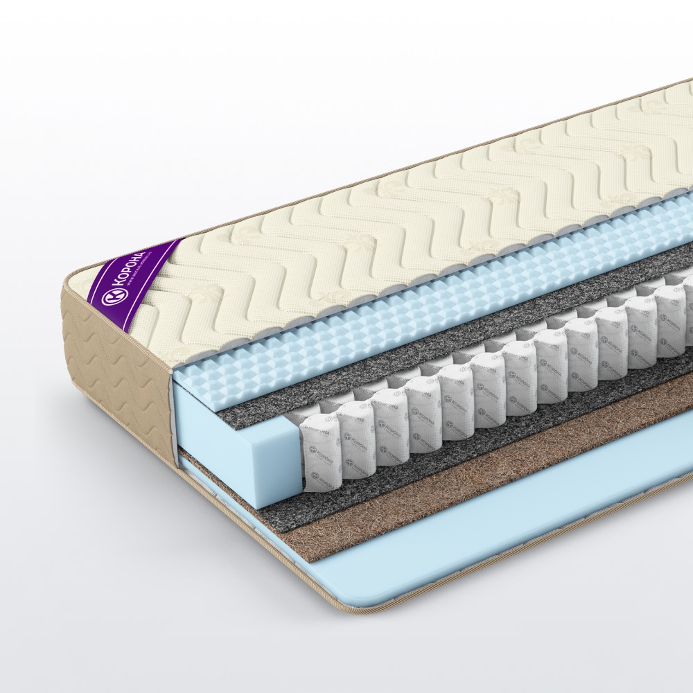 Популярная модель с различной жесткостью сторон. Мягкая сторона из гипоаллергенного массажного эластичного пенополиуретана разгружает позвоночник. Более жесткая сторона с кокосовой койрой и пенополиуретаном обладает высокой воздухопроницаемостью, что делает ее более прохладной.